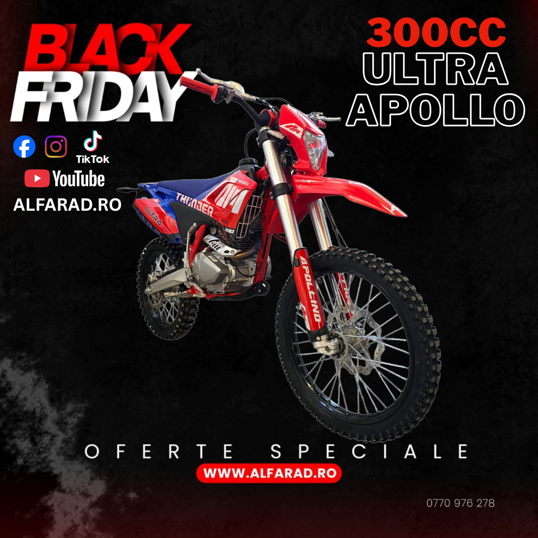 Apollo Ultra 300cc este o motocicletă de cross puternică și fiabilă, monocilindru în 4 timpi. Oferă un raport excelent între putere și greutate, fiind ideală atât pentru pasionații de off-road, cât și pentru cei care caută un vehicul versatil.